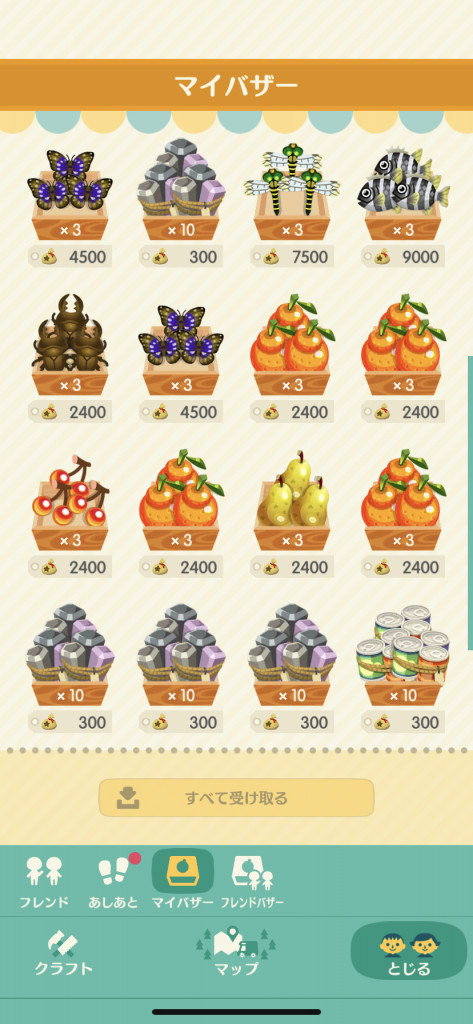 バザーで売ってるもの 適当に虫、魚、果物レアもあるし、通常のもある 最高値では、ありません 制限なし