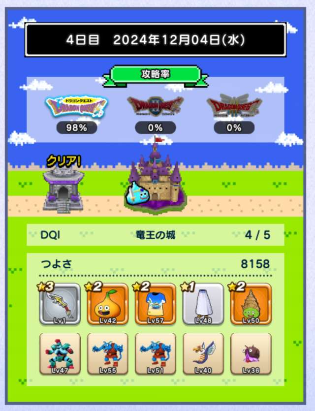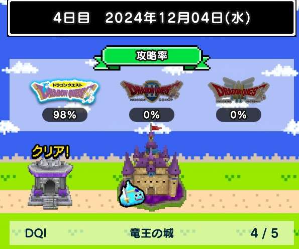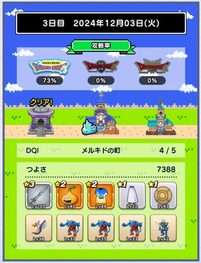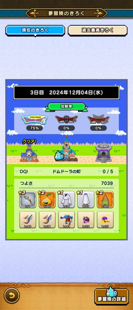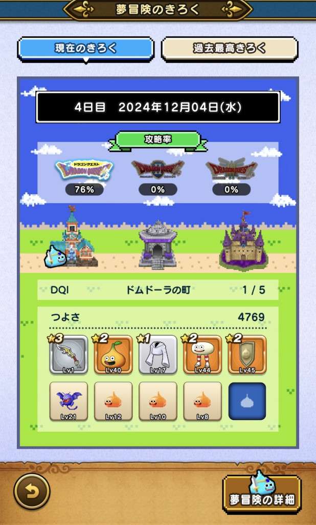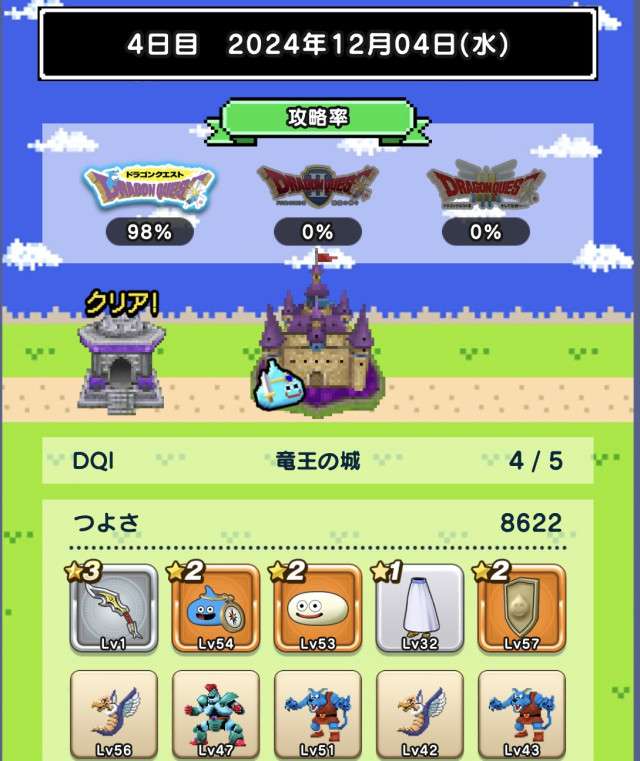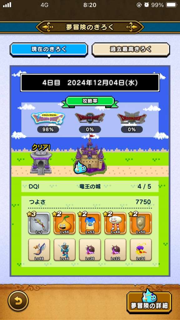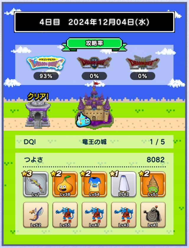 みんな続々りゅうおうの城へ。次回は4日でりゅうおう撃破か・・・。初回は10日かけてもりゅうおう倒せなかったなんて信じられない。おやすむは90日の歴史があって冒険者達も超一流。
