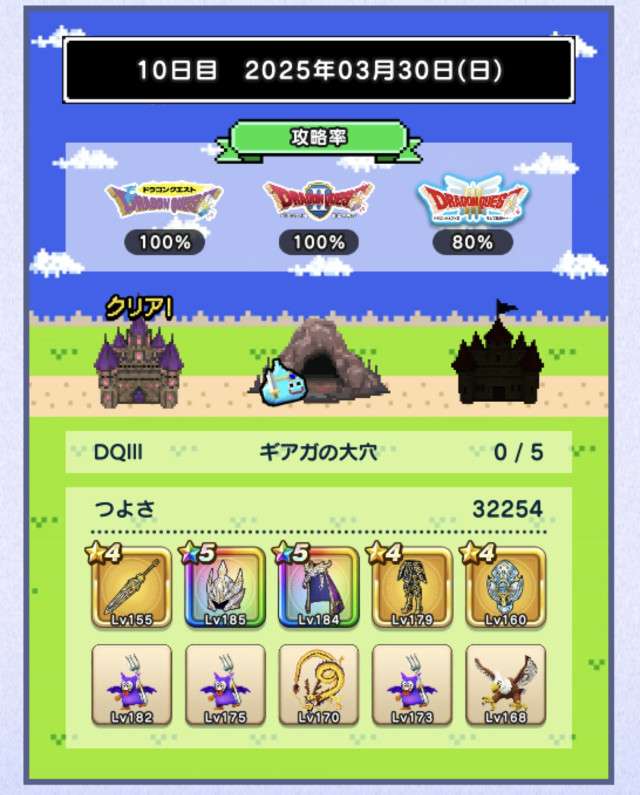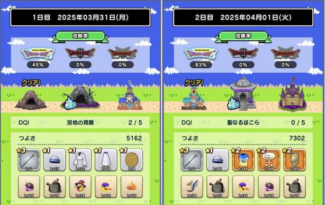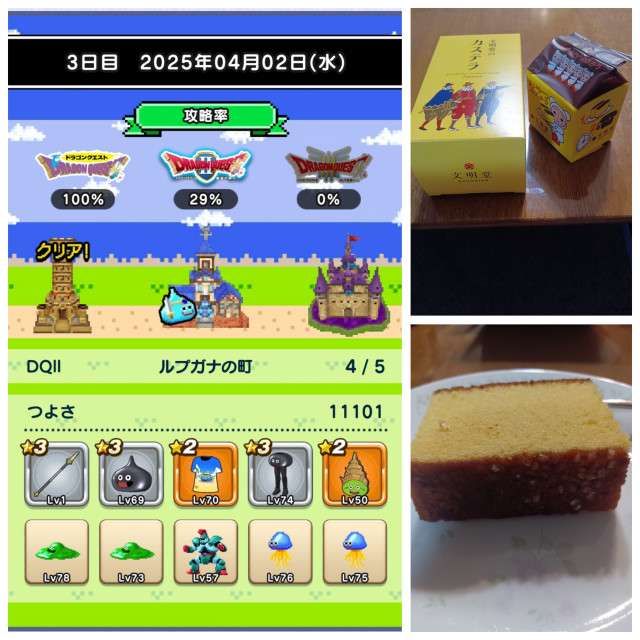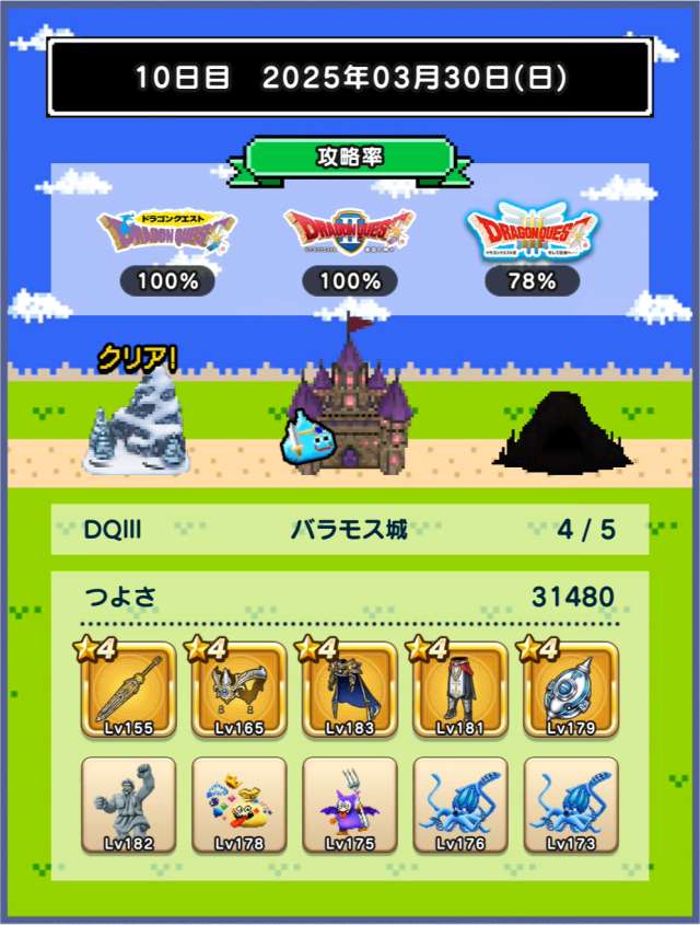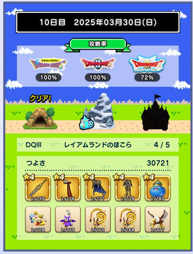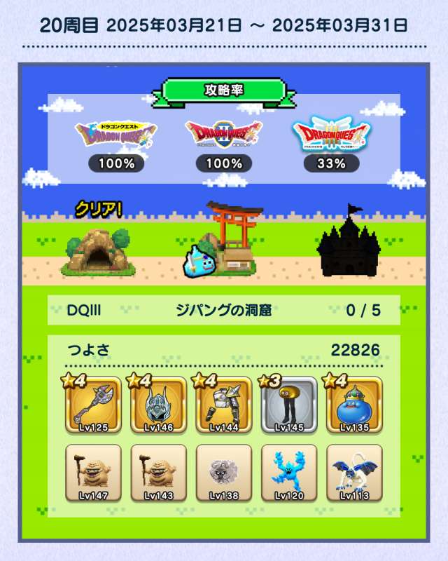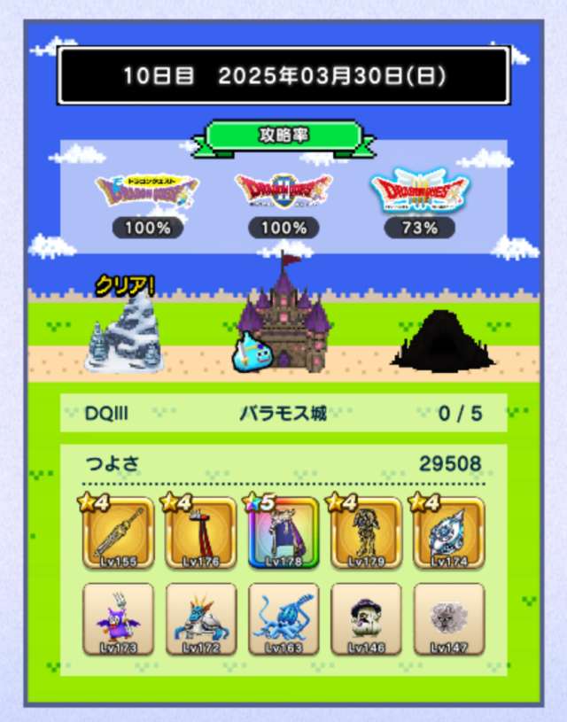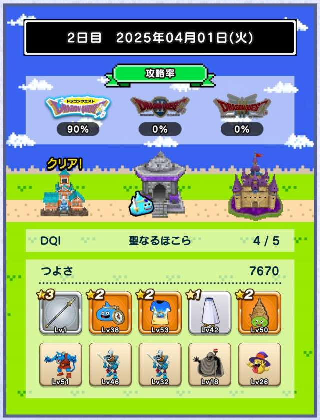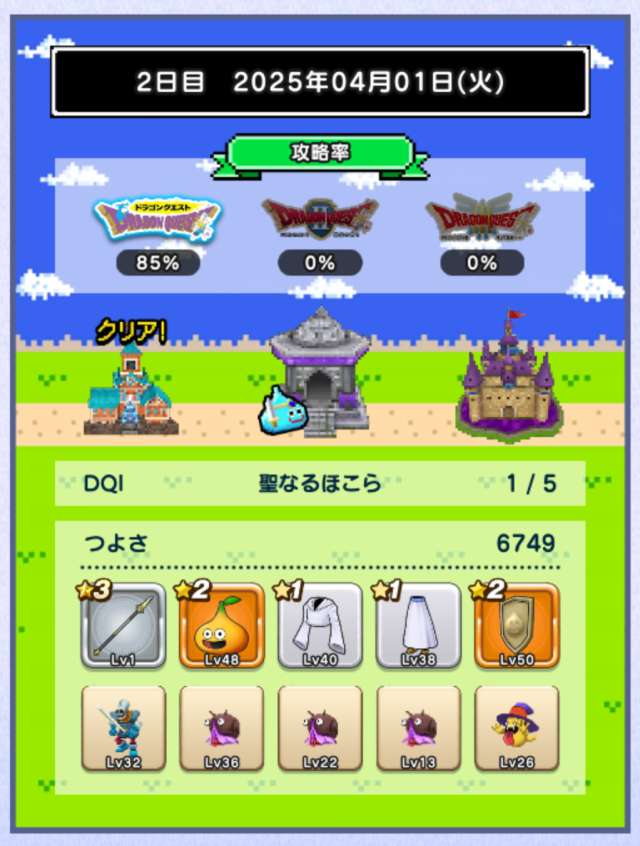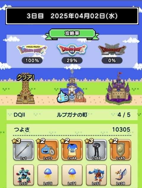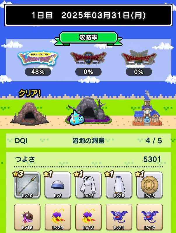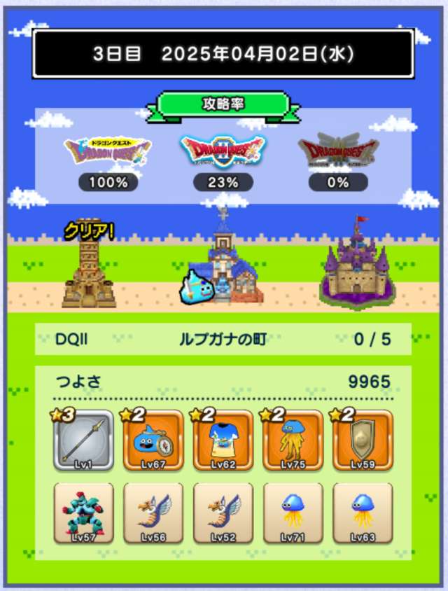 3日目 進捗+5、つよさ-100超、宝宝沼沼沼。鎧騎士(47)、祈祷師(95)。図鑑ボーナス🌈は遠い。