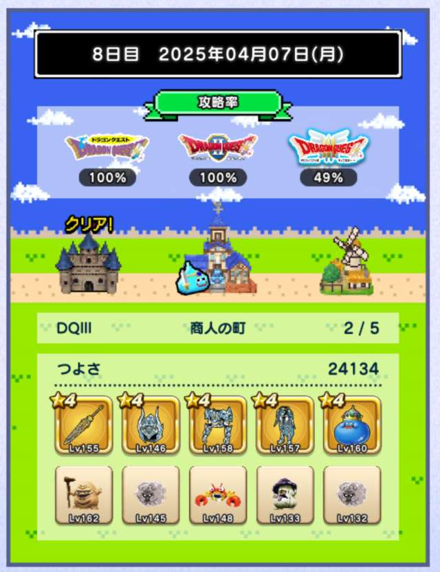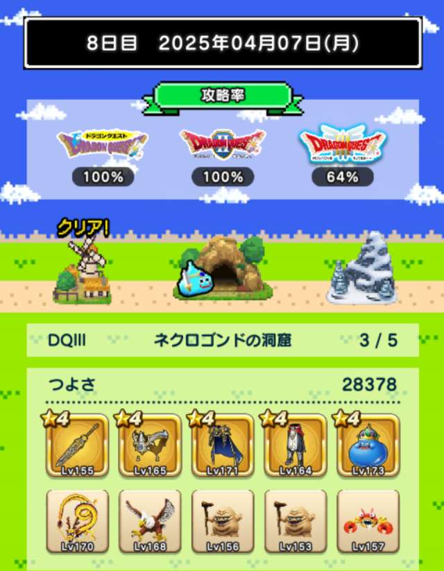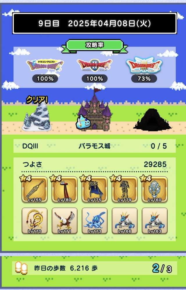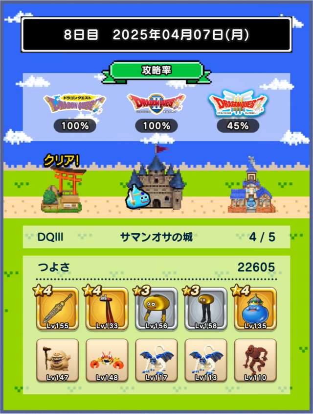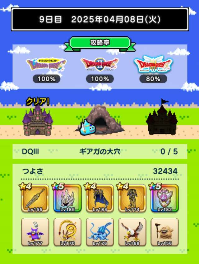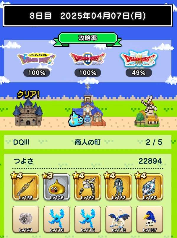 図鑑はおどるほうせきが銀になり、バラモスが載りました。今日は戦闘9回中仲間入れ替え5回、装備入れ替え3回という最終日らしい上振れに。仲間はベビーサタン4体というフォアカード、保育園状態で終了。