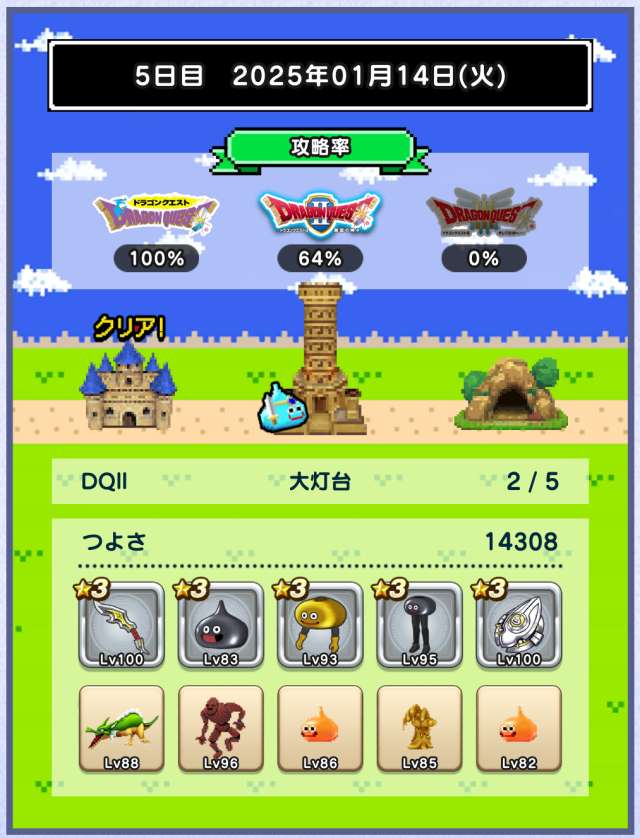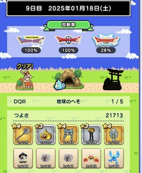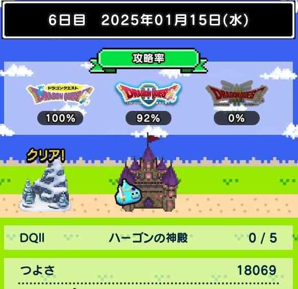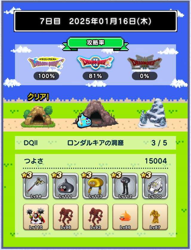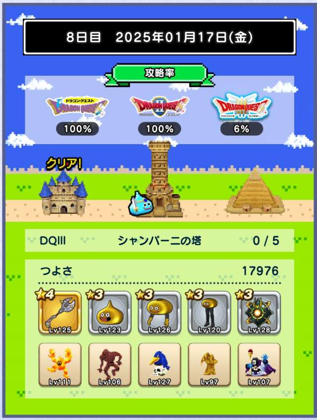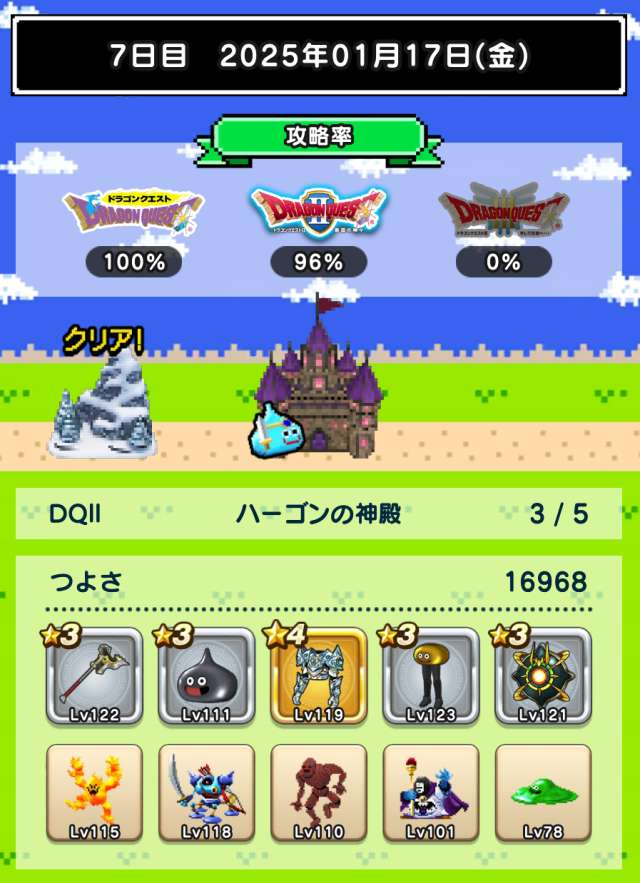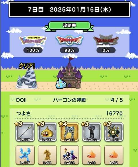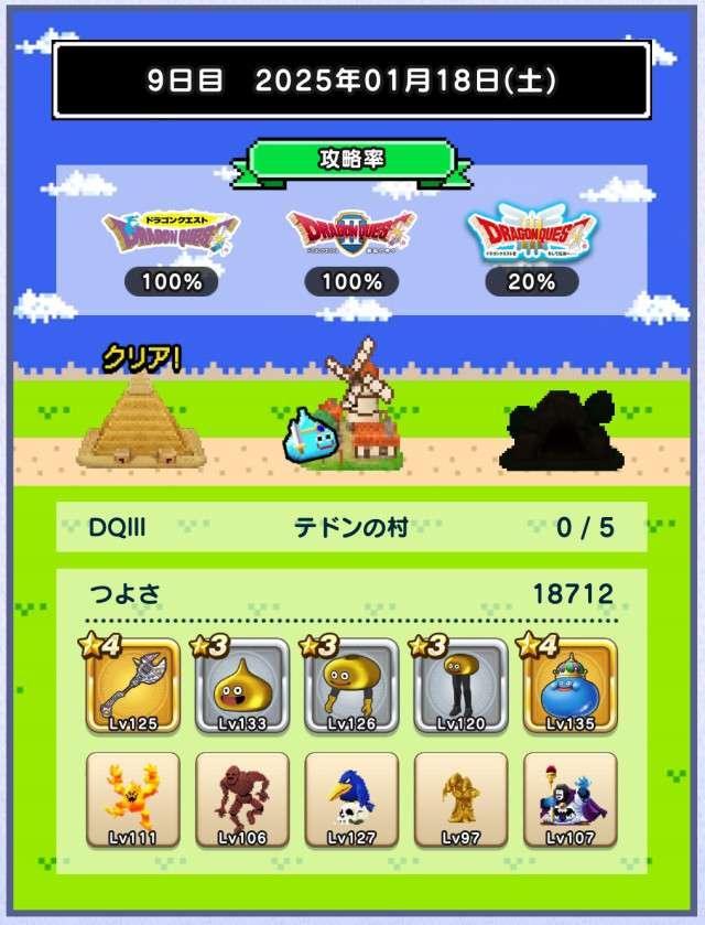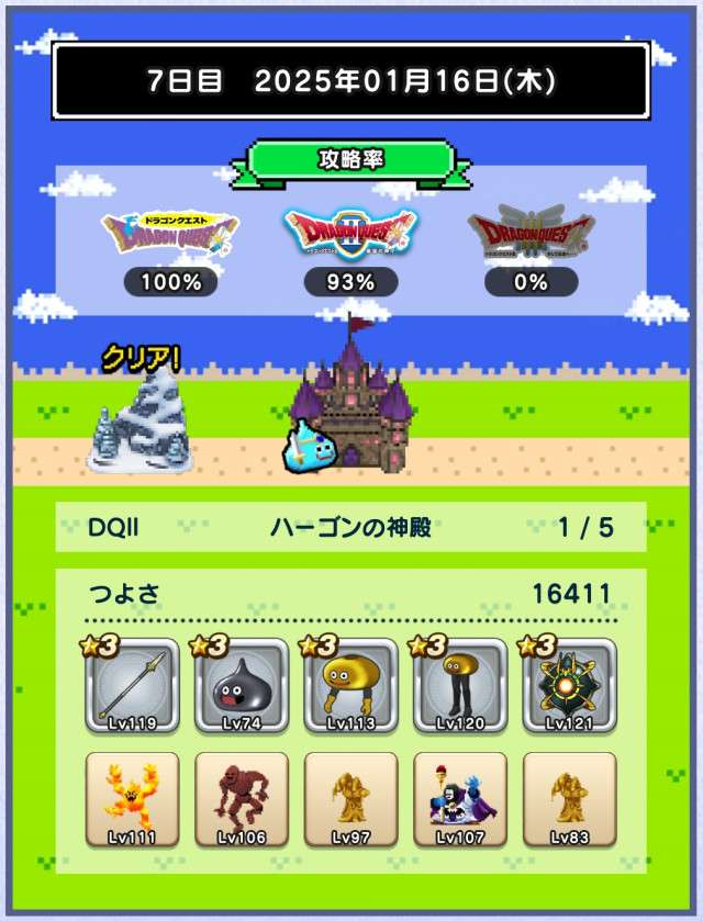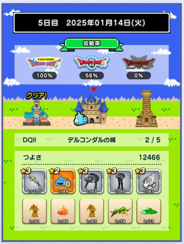 仲間の入れ替えなし、装備の入れ替えはカンダタのドロップのみで、ますますつよさ不足が深刻に。あと1日でランシール(地球のへそ)には入れるだろうけれど、クリアできるかどうかは微妙。