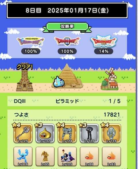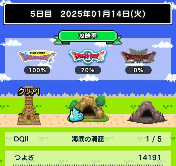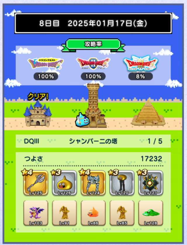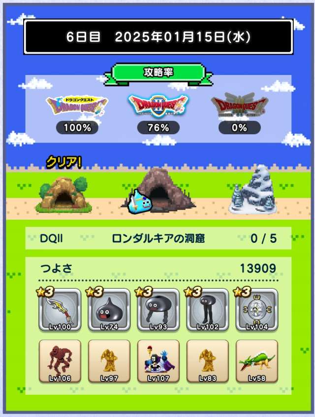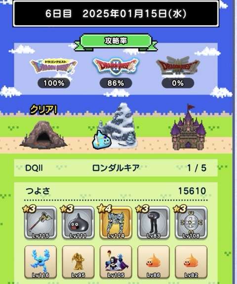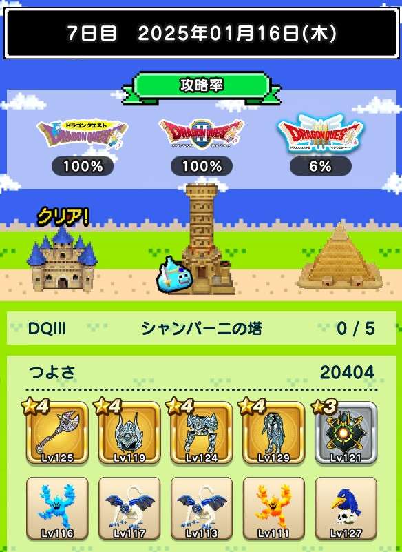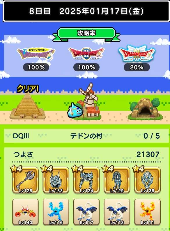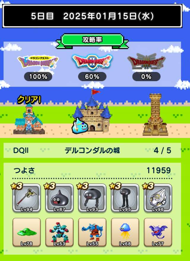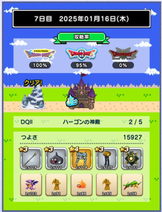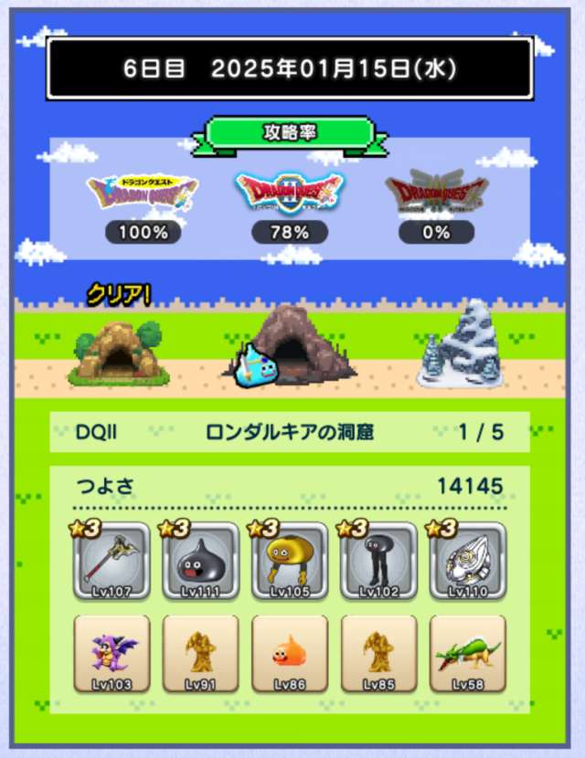 仲間の入れ替えなし、装備の入れ替えはカンダタのドロップのみで、ますますつよさ不足が深刻に。あと1日でランシール(地球のへそ)には入れるだろうけれど、クリアできるかどうかは微妙。