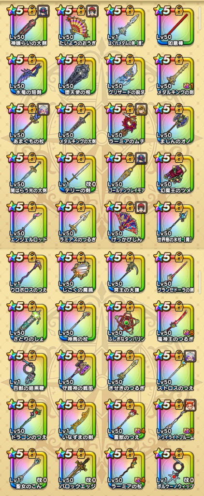 守り人Lv71(雨雲杖) ⇒ 大神官Lv68(太陽扇) ⇒ ニンジャLv73(ラ鞭) ⇒ 魔剣士Lv50(神喰大剣)