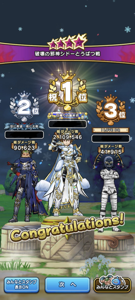ラッキータロット、勇者のきあいため、ロンド2回(忍者)、アンコール、フォースブラストで一ターン目に60万ダメ