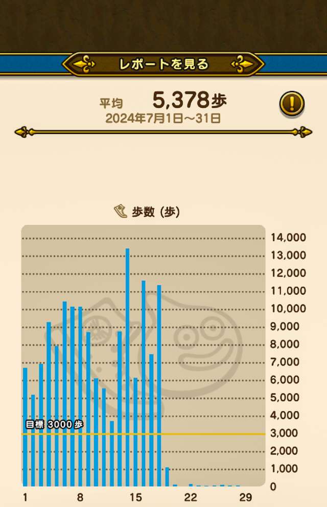 8/8(日)に11,800歩ほど歩いてアーススライムにした後、8/9(月)~8/15(日)の7日間を1,000歩以下キープ。