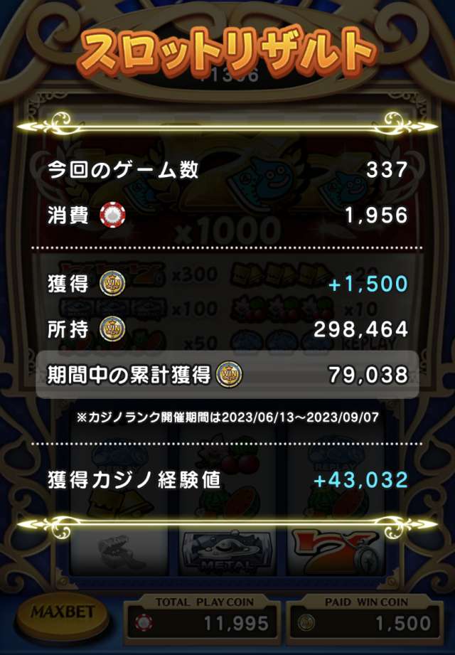 昨日はさんざんでした。デュランDD、キラマ2DD、竪琴D、ボーナスダンジョントホホ✕3、おまけにスロットもこれ。7の日効果込みでこの結果ってあんまりじゃない?