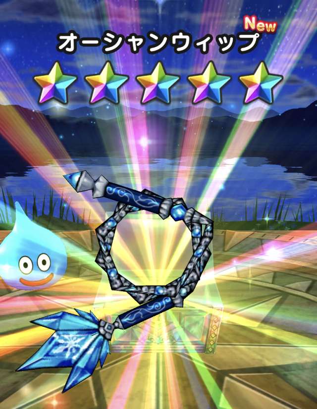 ヒャド防具が乏しすぎるので再度マイレージで世界樹ガチャを回したらオーシャンウィップが当たりました。氷杖3本ある状況で…と思いましたが改にして魅了を狙う状況なら使う可能性あるかも…?ちなみに防具は当たりませんでしたw