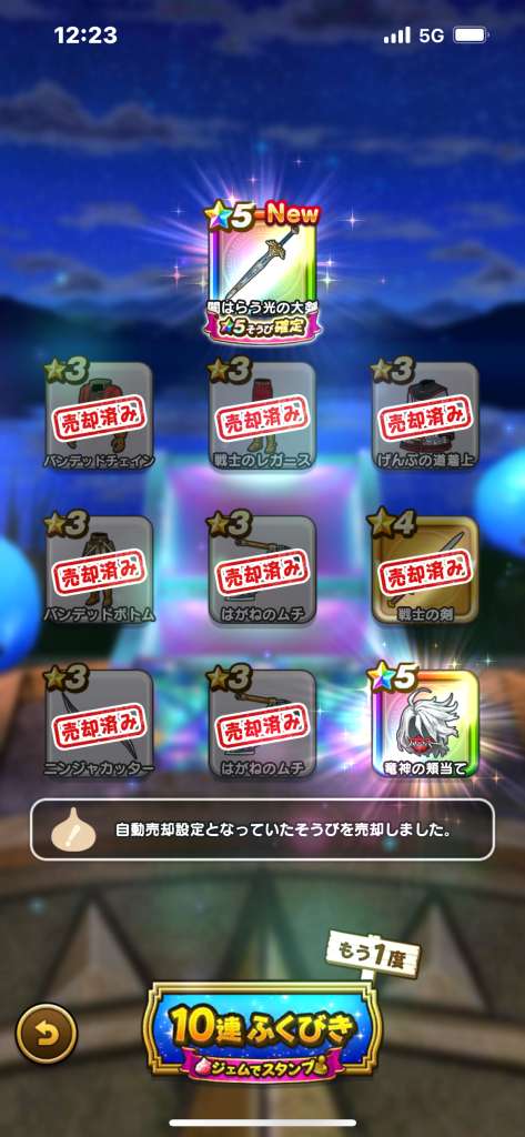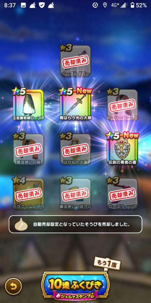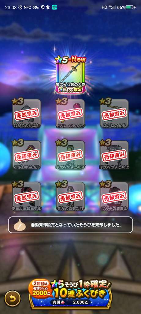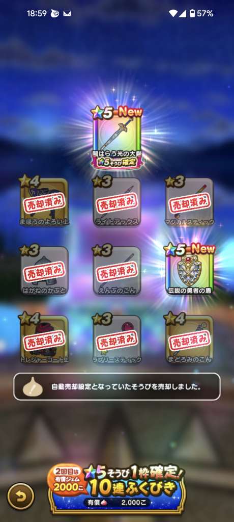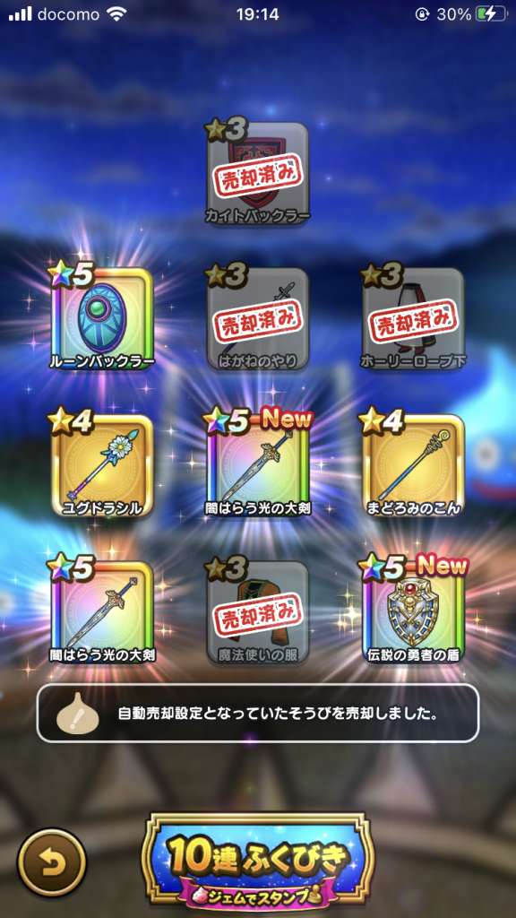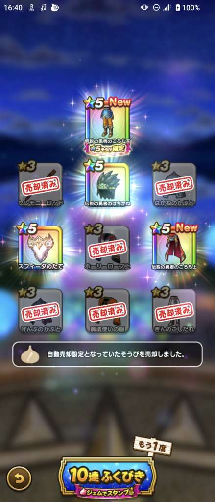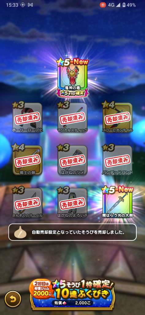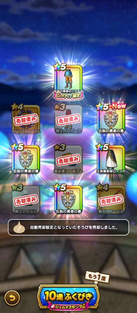 半年溜めたジェムぶっぱで、剣と盾だけ当たれば即撤退で引きました。