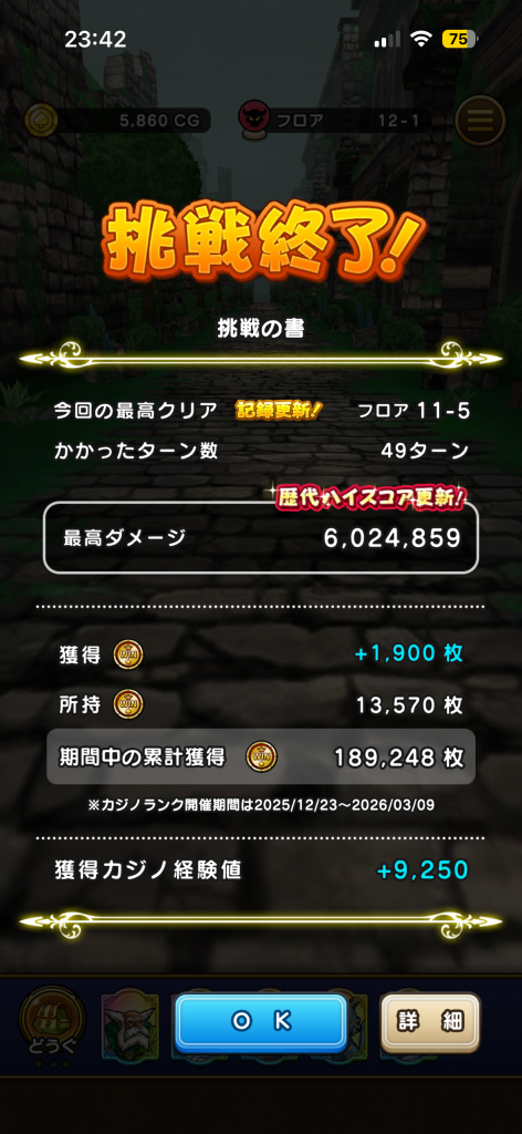 ドラぽか挑戦の書の最高ダメージは攻略とは別で叩き出したらいいんかな。12-1でやられてもうた。上位狙うならカードのレベルも大事ですね、、