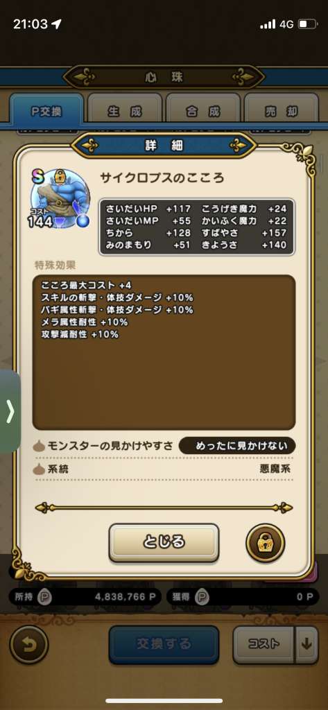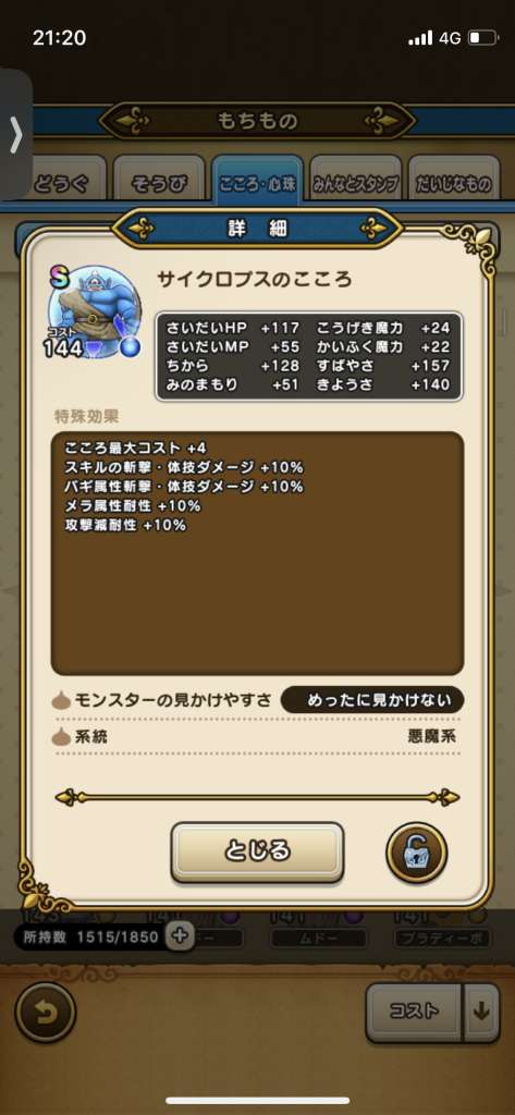 ドラクエウォークの「サイクロプスのこころ」の性能・ステータス順位、必要個数を掲載!心珠ポイントへの交換効率や出現場所などもまとめていますので参考にしてください。