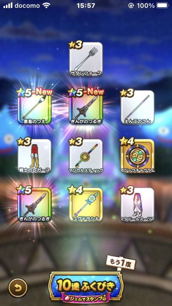 せっかくの周年なんで6万ジェム行くぞーと思いきや3万で収穫あったので3万で円月輪狙うかーと思ったら6万ごっそりもっていかれました。。。また来年。