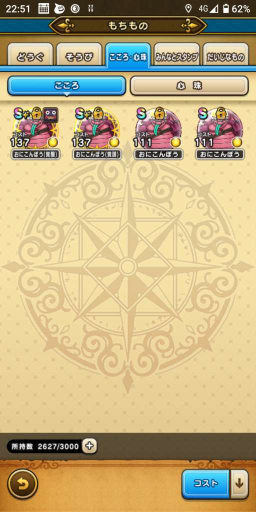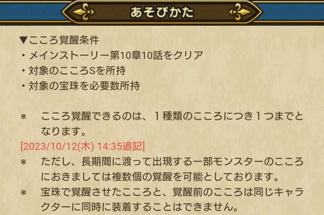 長期間に渡って出現する一部のモンスターのこころは複数個覚醒できる。と公式であったので、おにこんぼう覚醒のこころは複数個の対象になるかどうかを試すため、てっきゅうまじんを何度か倒していたところ、既に覚醒おにこんぼうを所持した状態でおにこんぼうの宝珠を落としました。