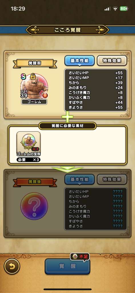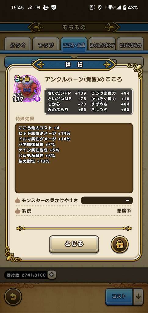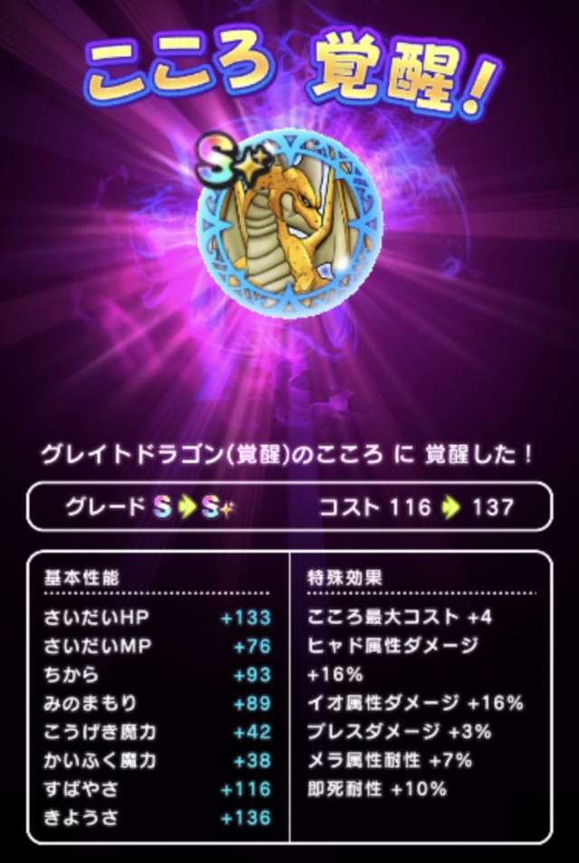 覚醒前と同様、こころ道で使えます。性能的には少し上がった程度です。こうげき魔力96→110で呪文ダメとヒャド属性ダメが上昇。暴走率も+5%まで上がっています。