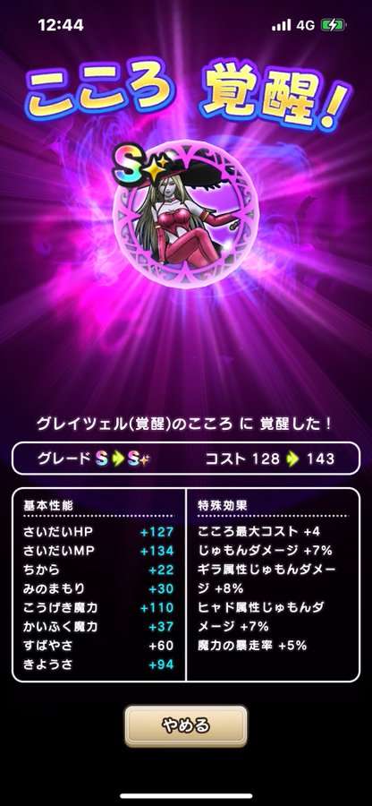 覚醒前と同様、こころ道で使えます。性能的には少し上がった程度です。こうげき魔力96→110で呪文ダメとヒャド属性ダメが上昇。暴走率も+5%まで上がっています。