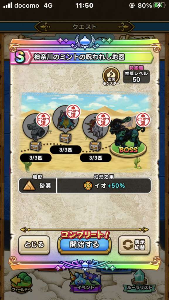![]() 黒竜丸 | 特級職 Lv.52 | ![]() 砂漠 | ![]() +50% |