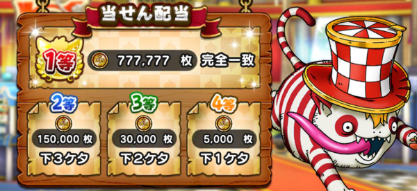 | 1等 | 完全一致 0.01% | WINコイン×777,777枚(通常時 500,000枚) |