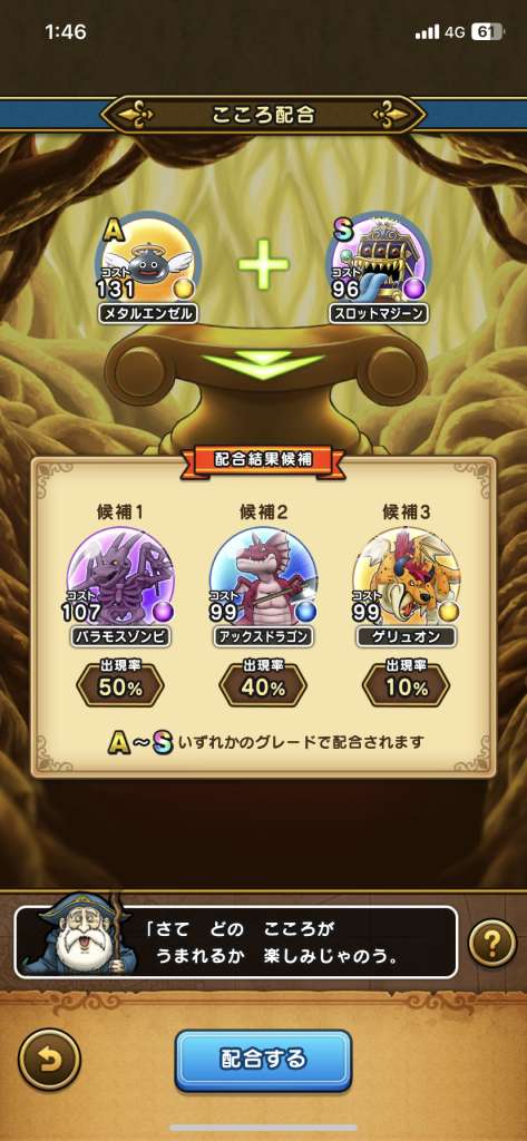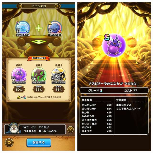 DQMコラボ開催記念で「こころ配合」というイベント機能が実施。モンスターズではお馴染みのやりこみ要素です。