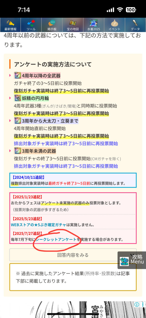 | 【2025/1/23追記】 おたからフェスはアンケート未実施の武器のみ投票対象とします。 (投票対象の武器が多すぎるため) 【2025/5/23追記】 WEBストアの★5ぶき確定ガチャは実施しません。 【2025/7/27追記】 毎年7月下旬にシークレットアンケートを実施する場合があります。 |