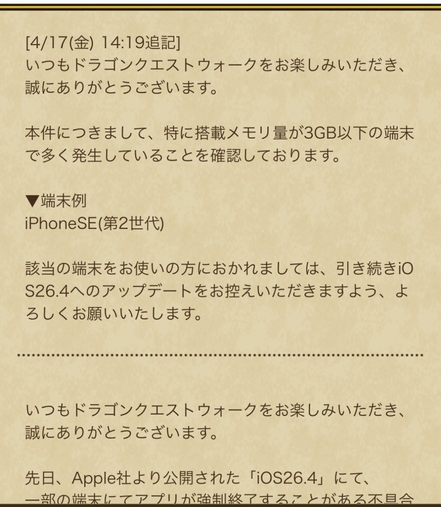キャッシュクリアとかしてもダメ。iOSが26.4.2だからなのかな?