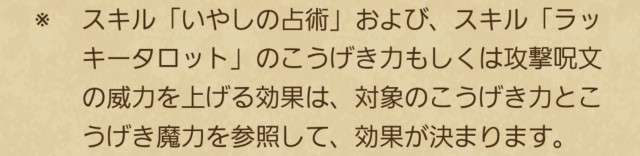 仲間ひとりの攻撃力か攻撃呪文の威力をかなり上げ 占い結果に応じて限界突破やさらに攻撃力か攻撃呪文の威力上昇が発生することがある