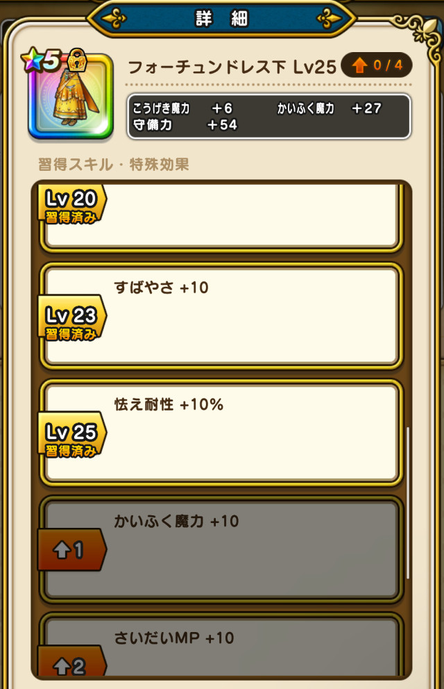 ドラクエウォークの防具「フォーチュンドレス下」の評価や習得スキル・特殊効果をまとめています。