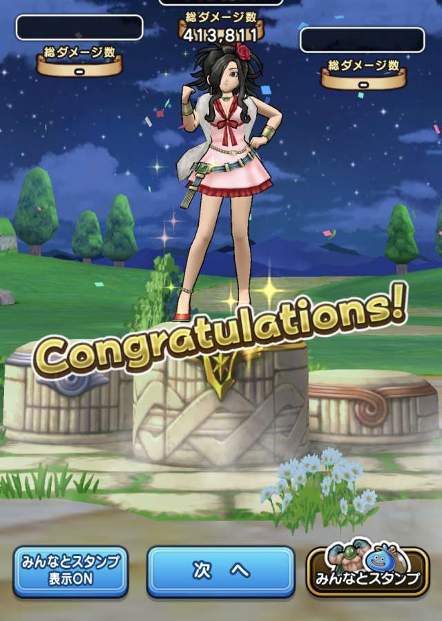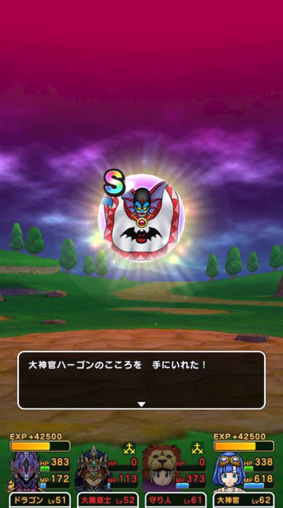 ガイア・くさなぎを持たせた魔剣士2人で2ターン目にお供、3ターン目にハーゴンにブラストして倒してます。1ターン目以外のダメージは全てにおうだちで防ぐので回復は無し。
