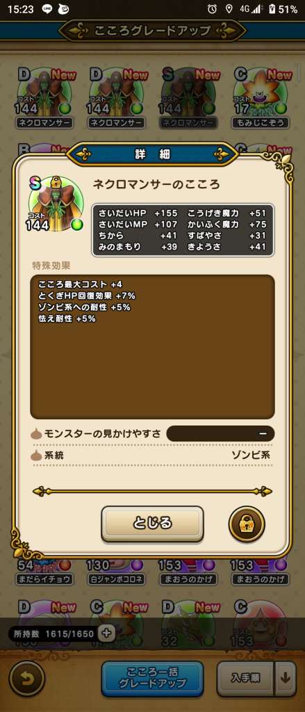 | こころ最大コスト+4 とくぎHP回復効果+7% ゾンビ系への耐性+5% 怯え耐性+5% | ||||