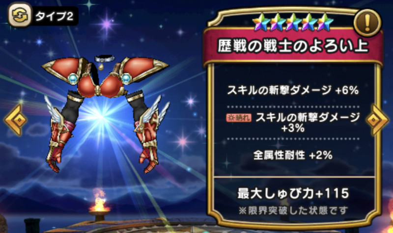 ドラクエウォークの防具「歴戦の戦士のよろい上」の評価や習得スキル・特殊効果をまとめています。