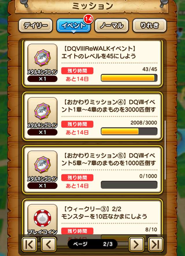 ドラクエウォークのドラクエ8コラボ(ReWALK)のおかわりミッションレベル上げミッションの解放条件と討伐数、報酬をまとめています。メタキンコインの総配布数&経験値、大量配布の理由についても掲載。