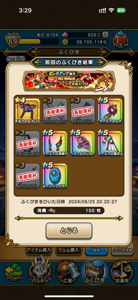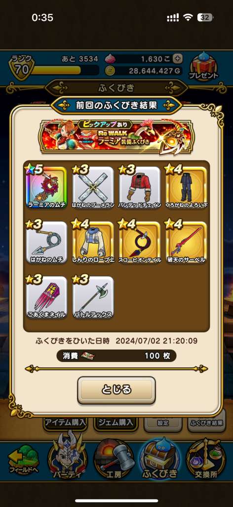 無課金で円月もなかったのだが、今回、ギガブレードとラーミア鞭が運良く手に入った。この武器コンビ最強だね!今まで全くクリアできなかったれんごくの祠も天気の祠も、もはや誰も死なずにクリアできるようになった、、、