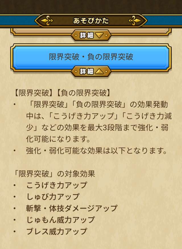 限界突破は上記の強化効果の上限を引き上げる効果です。例えば、通常は2段階までしか上がらない攻撃力を3段階まで上げることができます。