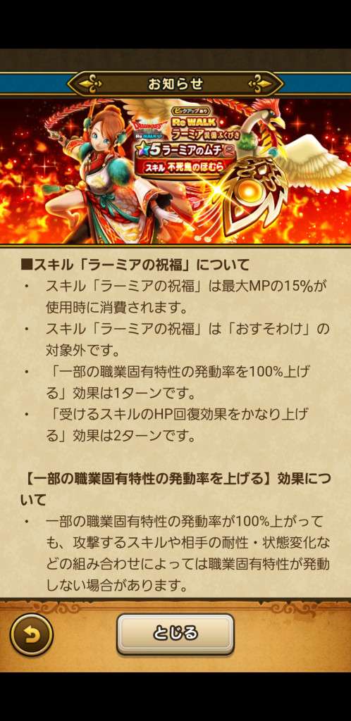 | Lv20 | ラーミアの祝福 / 消費MP 最大MP15% 味方1人の一部の職業固有特性の発動率を100%上げ さらに味方全体の受けるスキルのHP回復効果をかなり上げる(戦闘中2回のみ使用可能) |