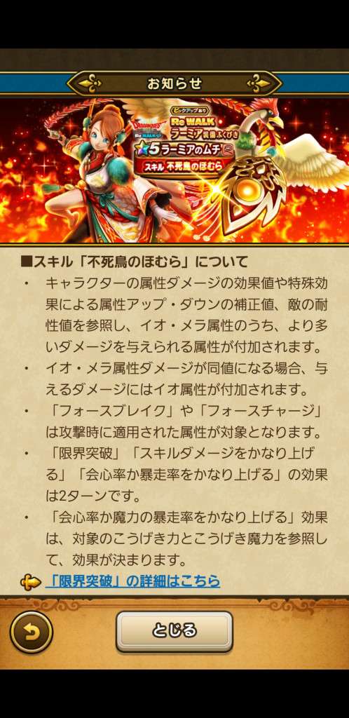| 練度1 | 不死鳥のほむら / 消費MP 57 敵全体にイオかメラの440%体技ダメージを与え 次に行動する味方1人に限界突破を付与し スキルダメージと会心率か暴走率をかなり上げる |