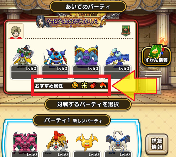 - ①対戦相手パーティの「おすすめ属性」表示