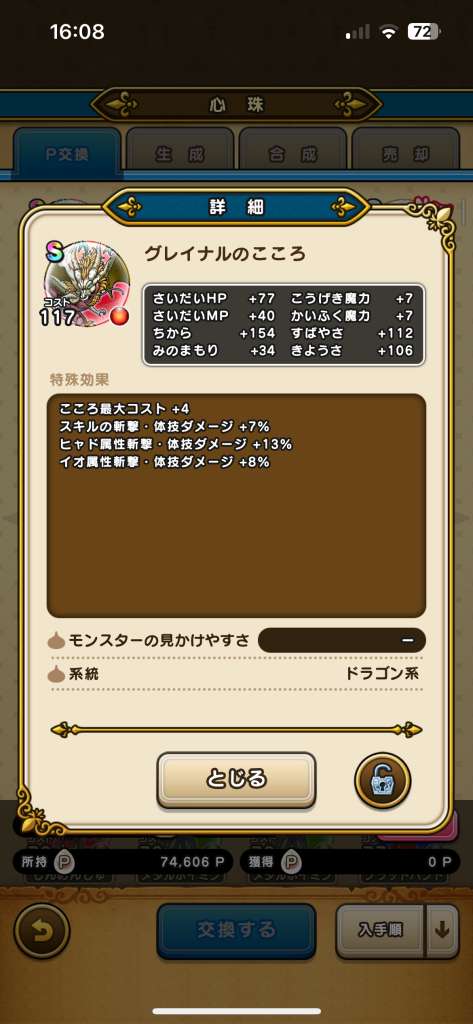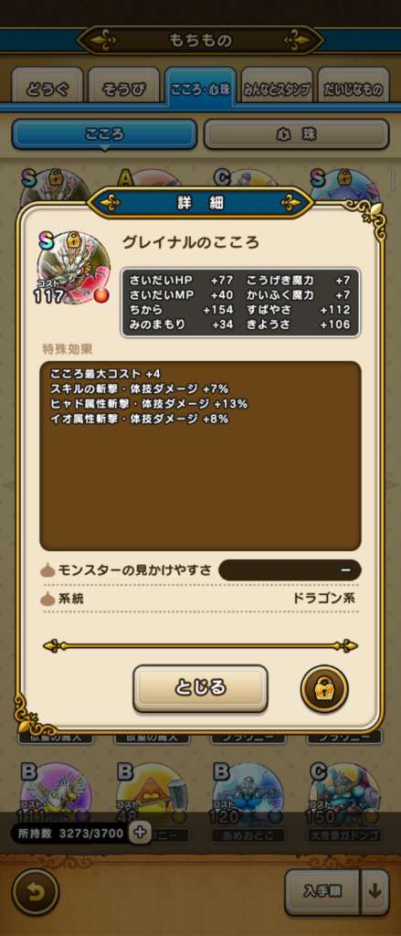 ドラクエウォークの「グレイナルのこころ」の性能・ステータス順位、必要個数を掲載!心珠ポイントへの交換効率や出現場所などもまとめていますので参考にしてください。