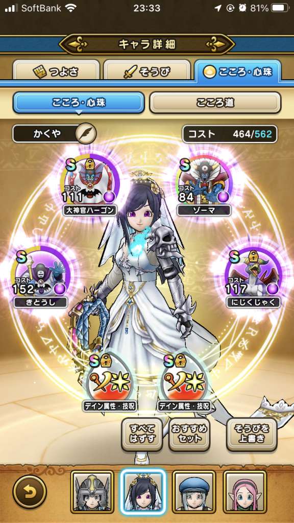 | こころ最大コスト+4 スキルの斬撃ダメージ+10% ヒャド属性ダメージ+5% みかわし率+5% ドルマ属性ダメージ+10%【晴れ】 スキルの斬撃ダメージ+5%【ブルーイーターのこころS装備時】 ヒャド属性ダメージ+5%【ブルーイーターのこころS装備時】 ドルマ属性ダメージ+5%【ブルーイーターのこころS装備時】 | ||||