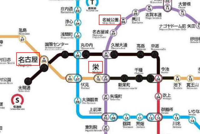 名古屋から名城公園には、東山線の栄で乗り換えしてください
