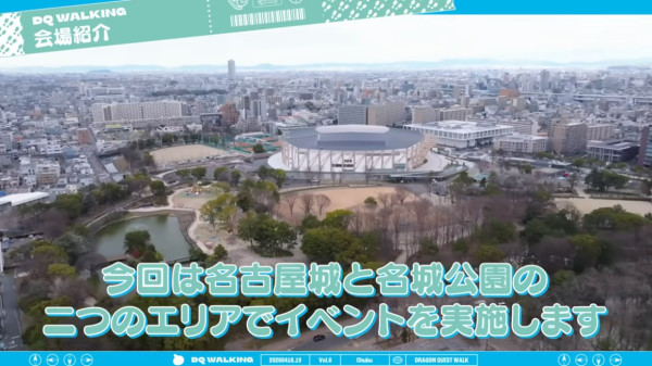 ドラクエウォークと連動したリアルイベントです。第6回は中部「愛知県名古屋市」の「名古屋城/名城公園/IGアリーナ」となります。