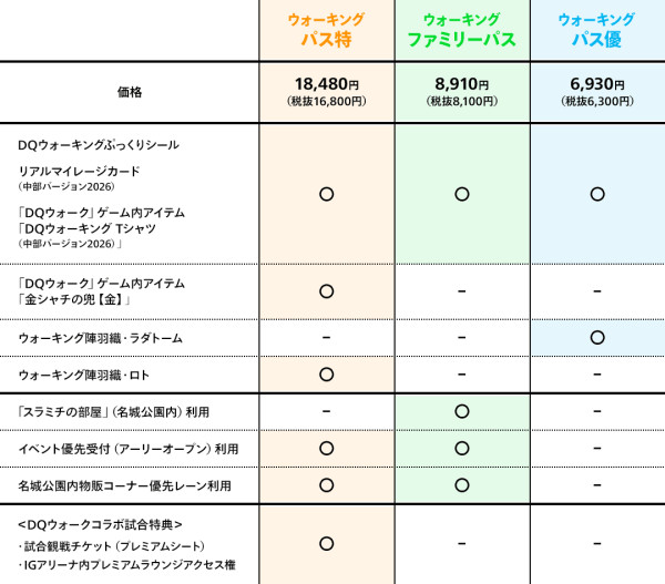 | パス | ウォーキングパス特 ※日付指定券 18,480円(税込) ウォーキングファミリーパス ※日付指定券 8,910円(税込) 中学生以下の同伴必須で家族限定4名まで ウォーキングパス優 ※日付指定券 6,930円(税込) |