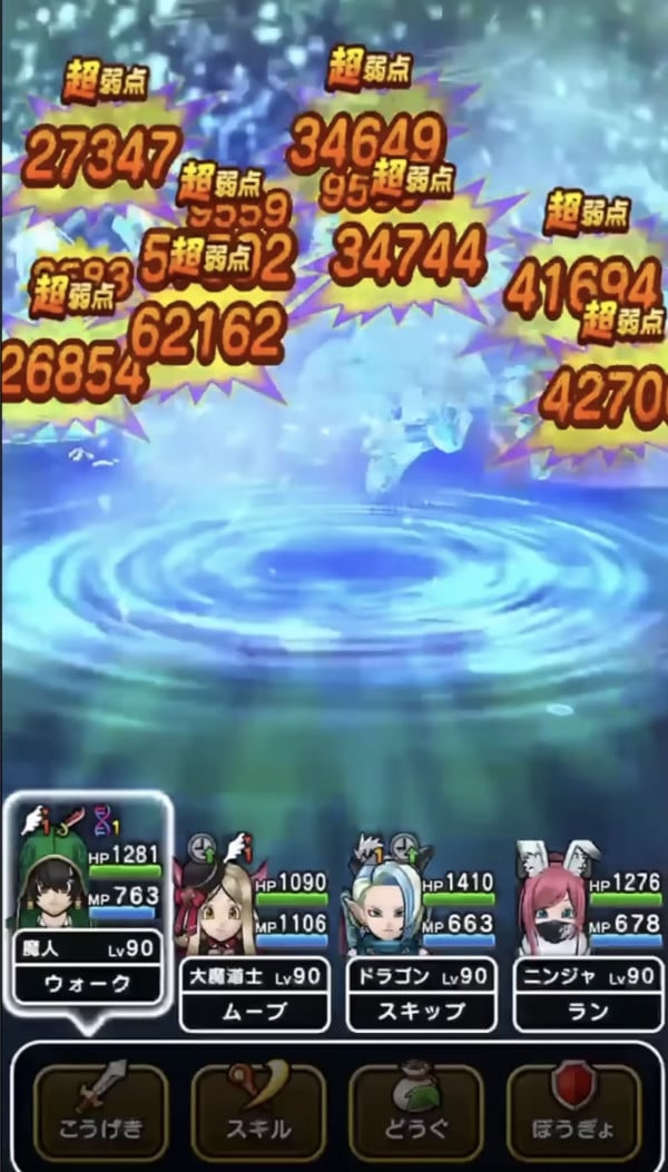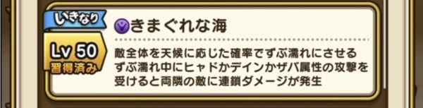 1スキルに3属性付いているタイプのスキルです。全体にヒャドorバギorザバ属性斬撃730%ダメージ(超会心化・必中)となります。メタル系に+99ダメージも付いておりずぶ濡れも付与可能。