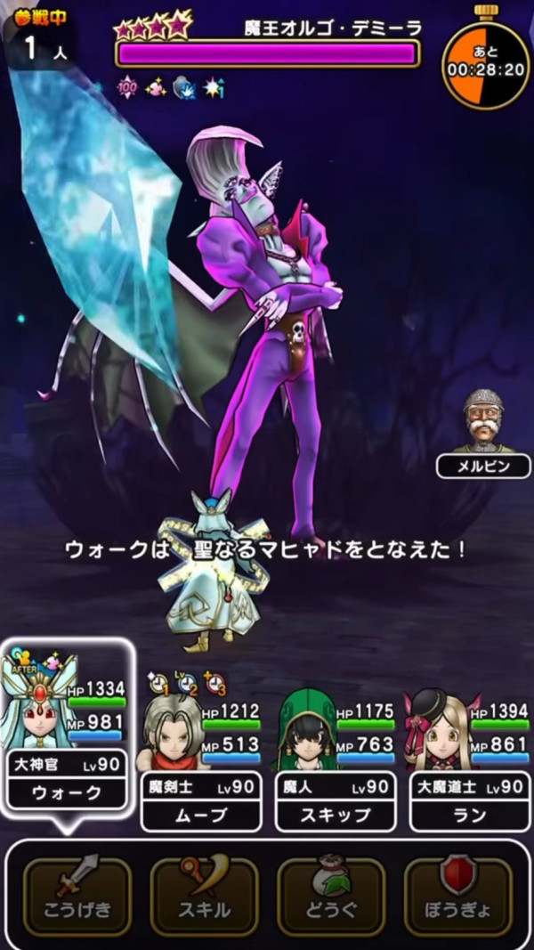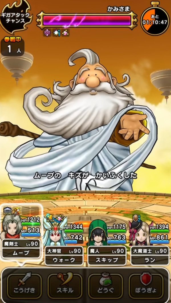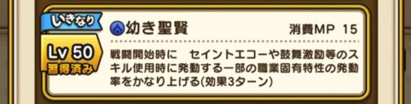 | 永続パッシブ | 僧侶レベル50(かいふく魔力+10) 踊り子レベル50(かいふく魔力+10) 遊び人レベル55(かいふく魔力+5) 賢者レベル90(かいふく魔力+15) スパスタレベル90(かいふく魔力+15) 大神官レベル70(かいふく魔力+30) |