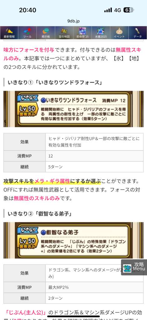 | ※「すばやさ」以外のすべてのステータスが対象。 (さいだいHP・さいだいMPも増えます) ※10Lvアップ時は「4%×10UP=40%」ではない (4%を10回乗算するため「48%相当」になる) (厳密には1Lv毎に小数点以下切り捨てを行うため誤差あり) ※いてつくはどう、戦闘不能では解除されない。 ※馬車との入れ替え、バトル勝利/敗北、メガモン等のコンティニューでリセット。 ※レベル上限や現在の経験値などは関係ない。 ※戦闘不能やふきとばし、石化では発生しない。 ※レベルによって効果が変化する効果は影響しない。 ※例えば、「エイトのこころ」「ポップのこころ」など。 |
