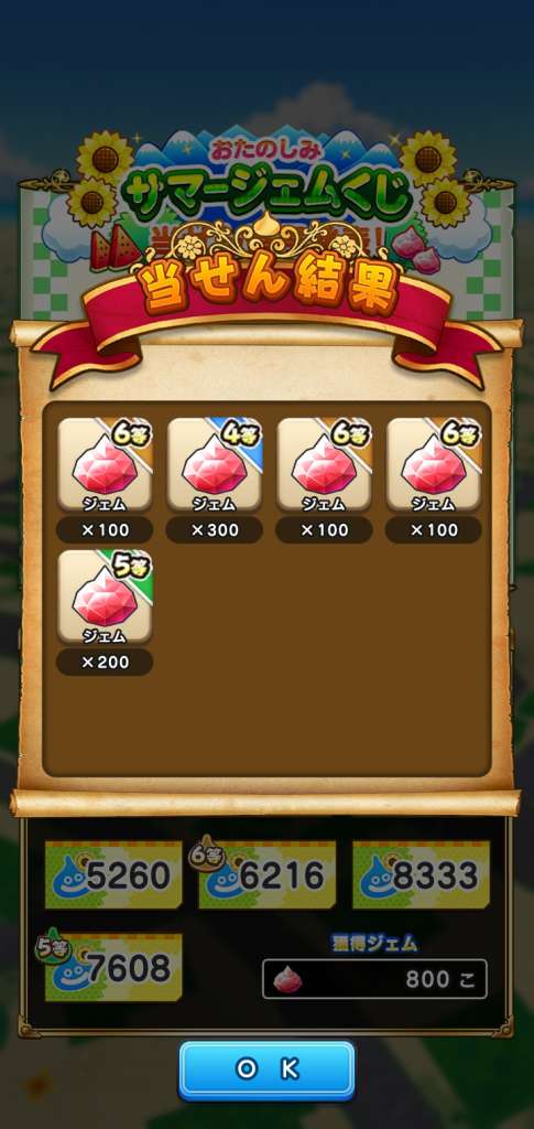 | 2等 | ![]() ジェム3,000 | -525 | 下3ケタが当せん番号と同じ |