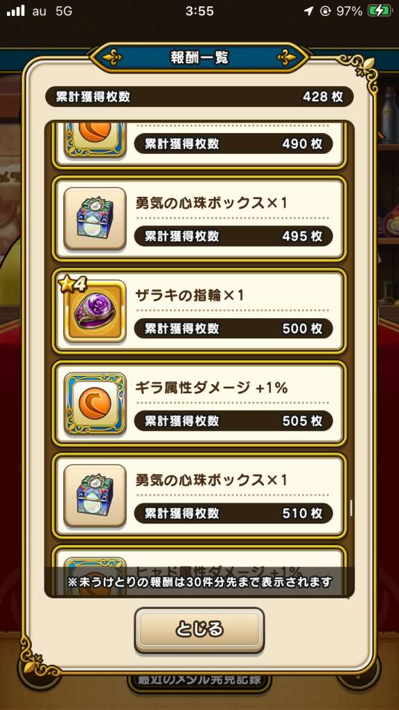私の場合、バトルマスターの極意書の後にヒャド属性ダメージ(155枚)、バギ属性ダメージ(160枚)、勇気の心珠ボックス1(165枚)が表示されています。