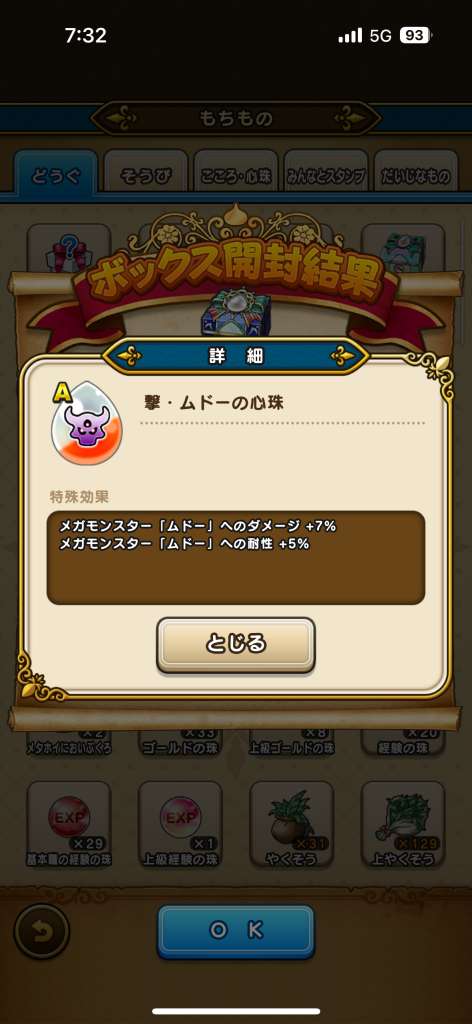 ゲットした「勇気の心珠ボックス」は「もちもの」から開封ができます。