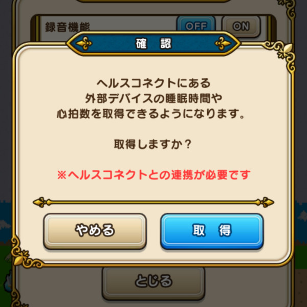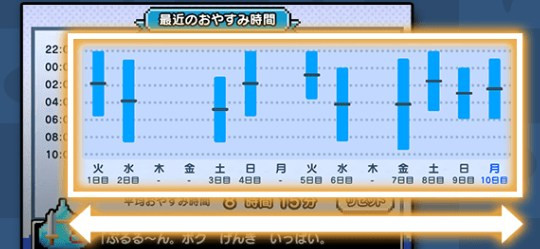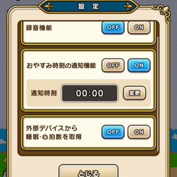 睡眠の深さや録音データの閲覧。音量が大きいと勇者スライムの夢冒険での会心が発生しやすくなる。