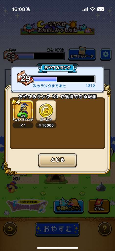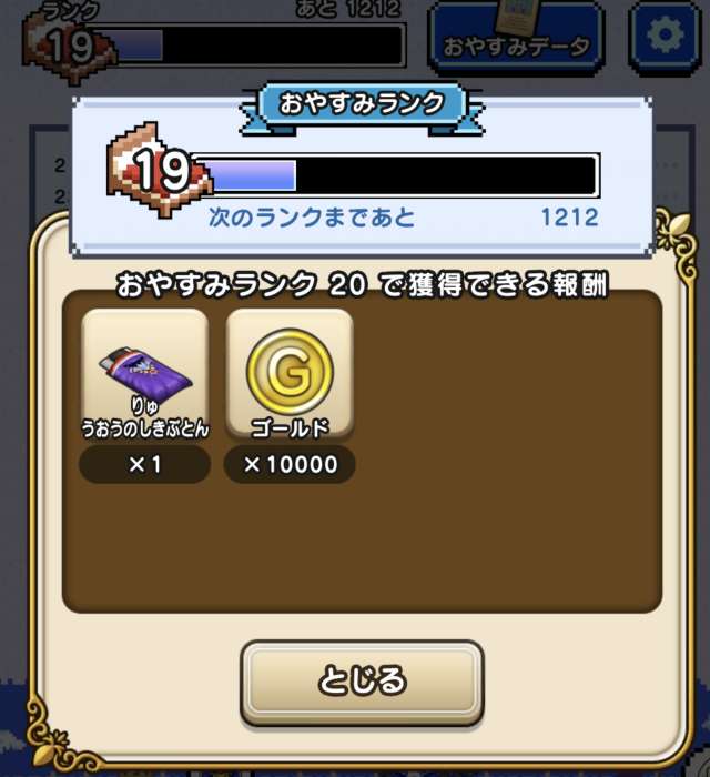 | おやすみランク20報酬 | 家具「りゅうおうのしきぶとん」×1 |