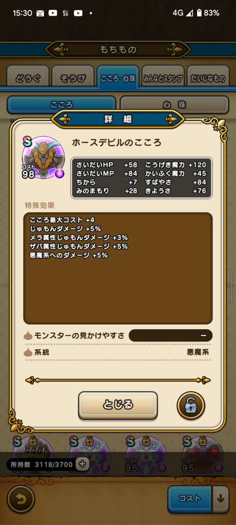 | こころ最大コスト+4 じゅもんダメージ+5% メラ属性じゅもんダメージ+3% ザバ属性じゅもんダメージ+5% 悪魔系へのダメージ+5% | ||||
