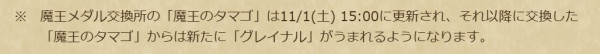 魔王メダル交換所の「魔王のタマゴ」は、11/1(土)15:00に更新され、新たに「グレイナル」が生まれるようになります。