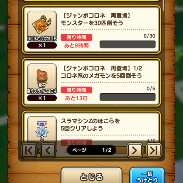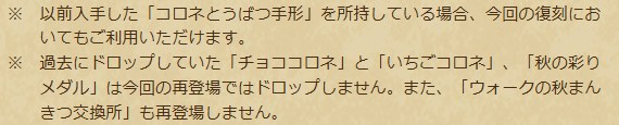 以前ドロップしていたアイテム「チョココロネ」「いちごコロネ」、そして「秋の彩りメダル」は今回はドロップしません。専用の交換所もないです。